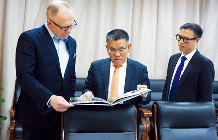 曾光安(中)向Pekka Vauramo(左)展示柳工紀(jì)念畫冊