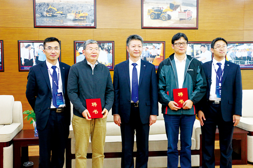 黃海波(中)與新聘柳工科學(xué)家胡永彪(左二)、曹華軍(右二)合影
