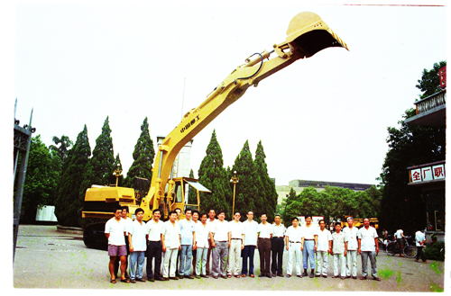 1992年,柳工第一臺(tái)自主研發(fā)的履帶式挖掘機(jī)——WY40正式下線,圖為公司領(lǐng)導(dǎo)及研制小組成員在設(shè)備前合影
